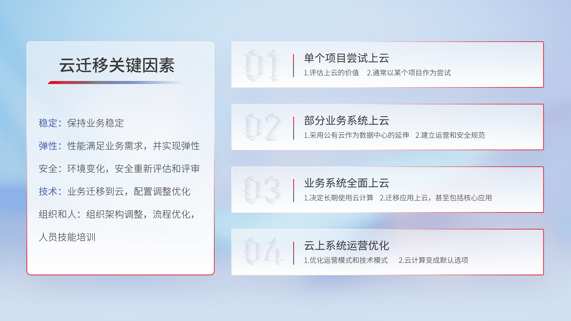 结合实际业务,,从规划设计、、云平台选型、、云原生改造、、、数据迁移、、集成交付,,迁移全过程为客户识别最佳上云路径,,,做好风险识别管理,,设计网络架构、、、身份权限、、安全审计合规、、、操作审计、、、、日志审计、、监控告警策略、、多站点容灾设计等,,,,对云上基础设施进行整体规划,,,,提升IT治理水平,,,,以满足弹性、、、、高可用、、、高性能的需求。。。