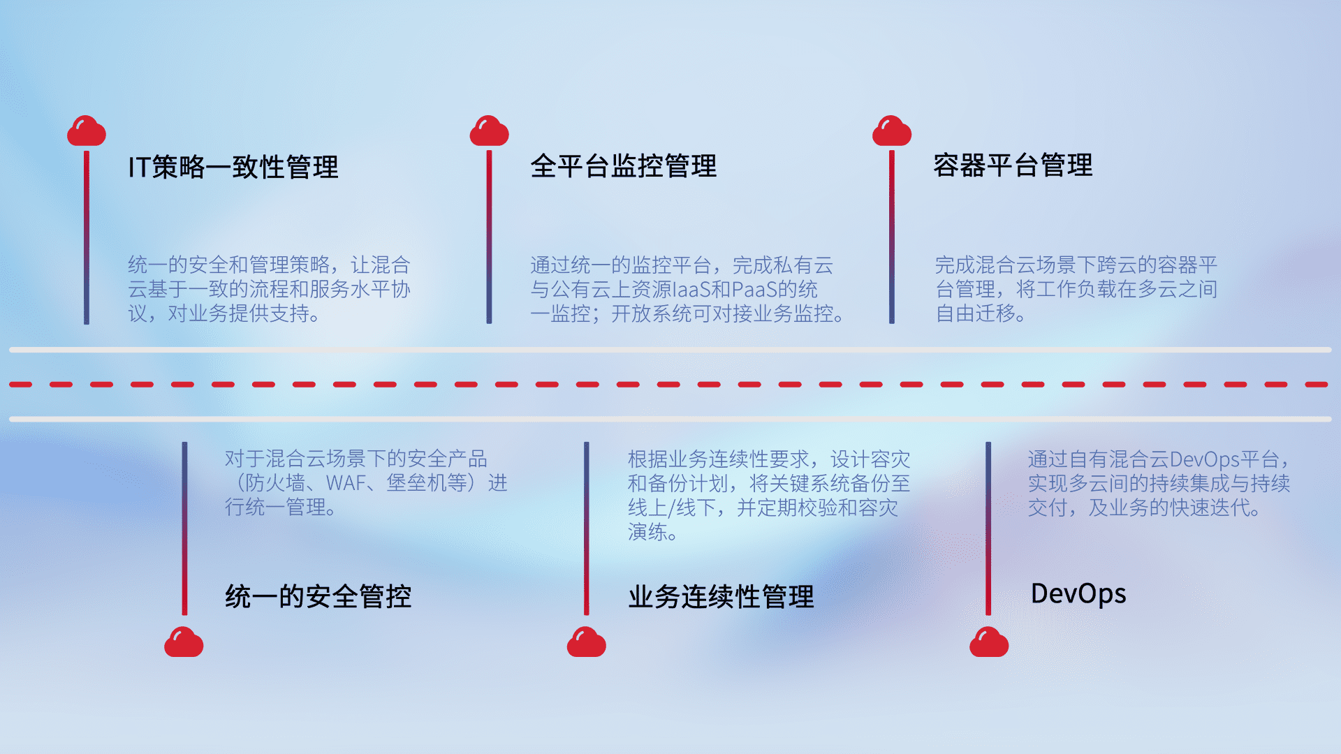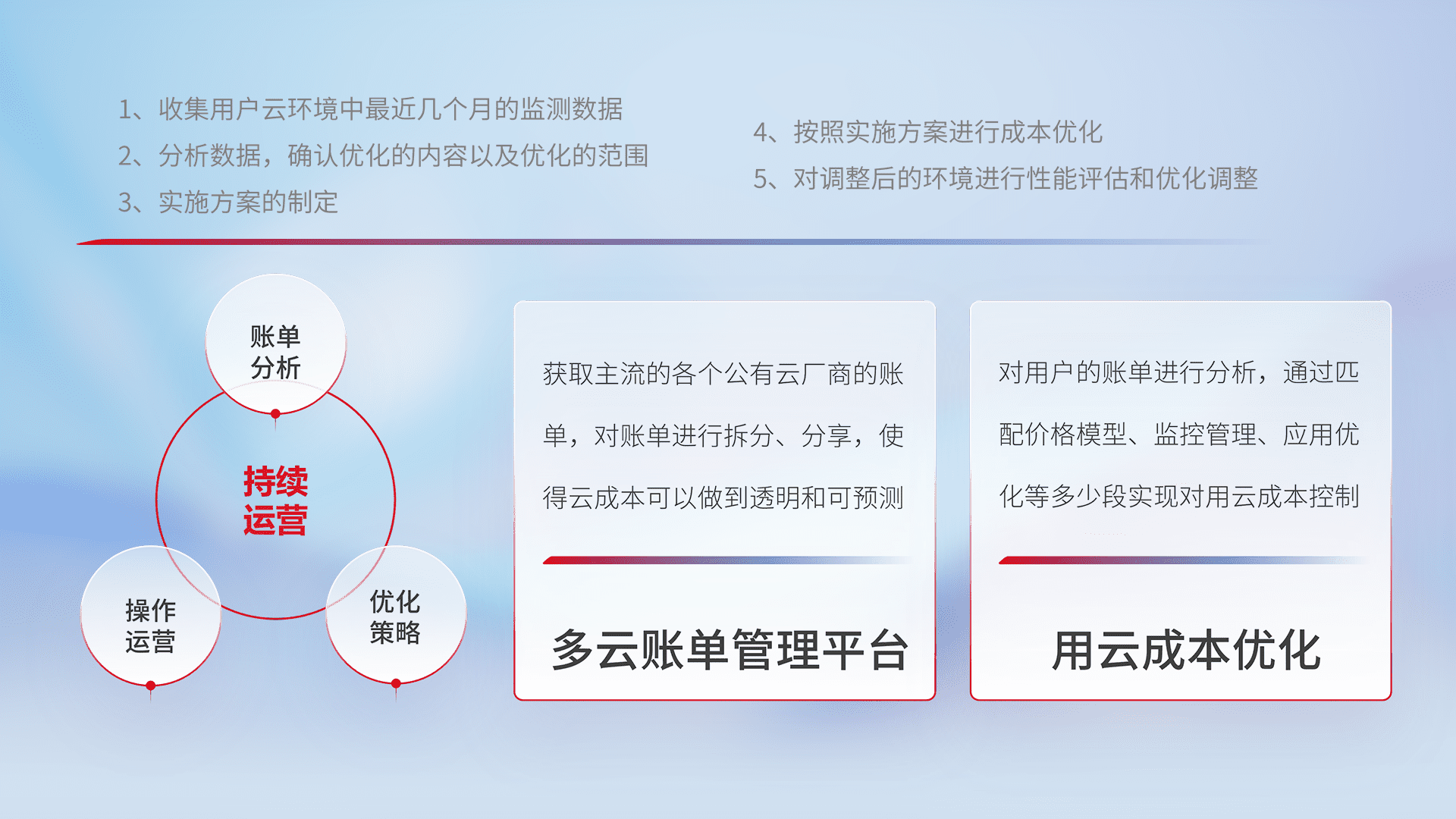 通过多云纳管,,以统一的资源数据模型把客户的云资源进行抽象和封装,,,,进而实现对多云资源的统一操作,,,,保障云资源管理的可靠性、、稳定性与可用性。。。。量身定制化运维内容,,,配置、、开发运维、、、补丁管理、、备份、、监控、、认证和访问管理、、审计和日常巡检等,,保障在用云过程中的可靠度,,,稳定度以及高可用率。。。。