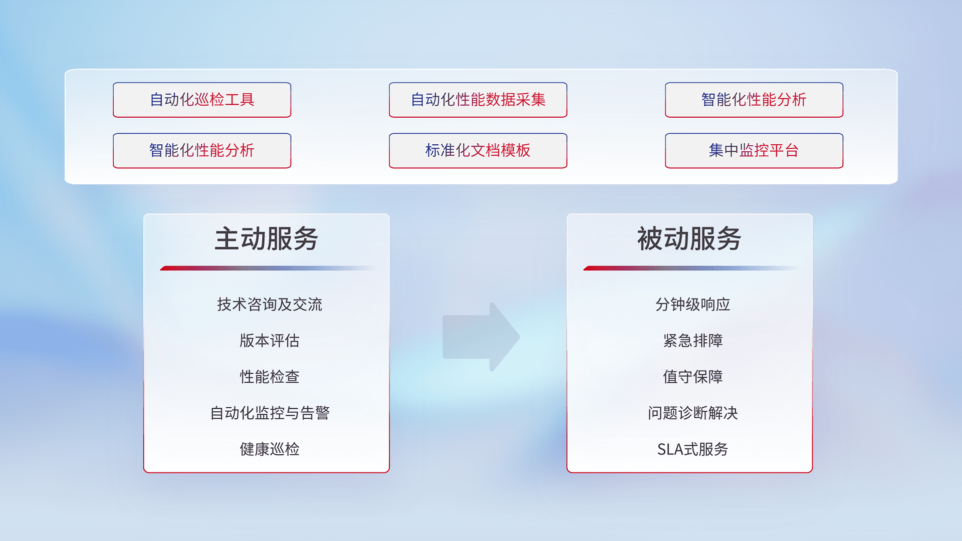 智能化工具和标准化文档,,,,保障服务质量,,提供主动服务(包含技术咨询、、、版本评估、、性能检查、、、、自动化监控与告警、、、、健康巡检)和被动服务包含(分钟级响应、、紧急排障、、、、值守保障、、、、问题诊断解决、、SLA服务)。。