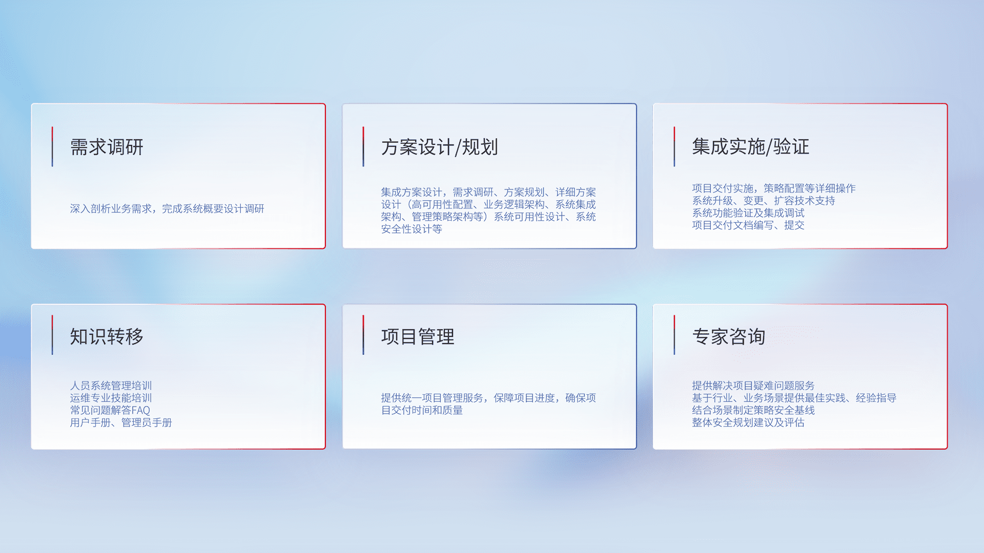 针对客户行业特性,,将宏观的安全战略和需求,,通过专业的交付服务,,,,实现项目落地,,,为客户提供标准规范的集成交付服务。。。。